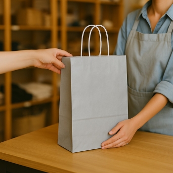 - Parlak gümüş rengiyle dikkat çeken şık ve dayanıklı bir kraft çantadır.