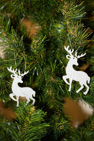 Yılbaşı Gümüş Geyik Simli Eva Ağaç ve Hediye Süsü 7x7cm 6lı